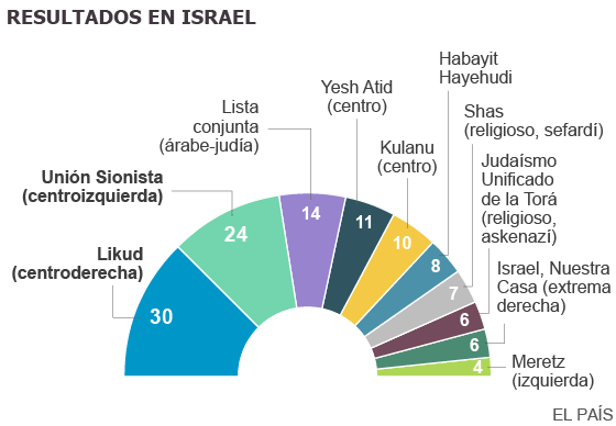 El resultado de las recientes elecciones de Israel dejó al partido Likud (30 escaños) ,de Binyamín Netanyahu, en una disyuntiva en la cual, para formar gobierno tendría que aliarse con partidos nacionalistas y religiosos que obtuvieron poca votación, o plantearse un gobierno de Unidad Nacional con el Campo Sionista (conformado por el Partido Laborista de Haim Herzgog y “Kadima” de la ex canciller Tzipi Livni), con 24 de los 61 o más escaños de los 120 del parlamento.