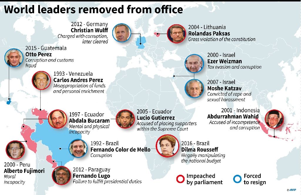 En América Latina a Abdalá Bucaram por corrupción e incapacidad mental (1997), y las vacancias del fugitivo Alberto Fujimori y de Pedro Pablo Kuczynski en Perú, sin contar una serie de fallidos pedidos de destitución en países como Chile, Argentina, etc.