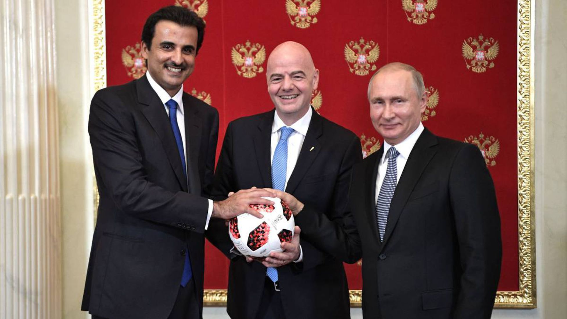 Vladimir Putin y Gianni Infantino entregaron el testigo del Mundial al Emir de Qatar, Tamim bin Hamad al Thani en 2018. FUENTE: DIARIO AS.