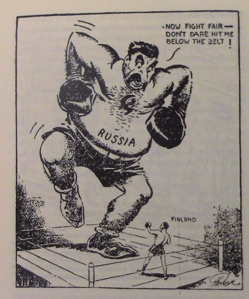 CARICATURA PUBLICADA EN EL DIARIO BRITÁNICO ¨THE LEADER¨ Y LUEGO EN EL FINLANDÉS ¨ HELSINGIN SANOMAT¨. (1939)