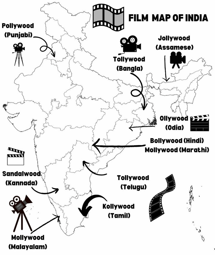 MAPA DE LAS MÁS IMPORTANTES INDUSTRIAS CINEMATOGRÁFICA DE INDIA: BOLLYWOOD SE ENCUENTRA EN LA PROVINCIA DEL CENTRO-OESTE DE MAHARASHTRA Y TOLLYWOOD EN LA PROVINCIA DEL NORESTE, BENGALA