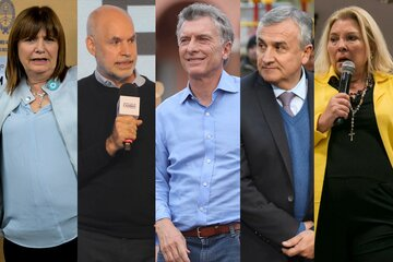 DE IZQUIERDA A DERECHA EX MIEMBROS DE JUNTOS POR EL CAMBIO: PATRICIA BULLRICH (PROPUESTA REPUBLICA, PRO); HORACIO RODRIGUEZ LARRETA, JEFE DE GOBIERNO DE LA CIUDAD DE BUENOS AIRES, PERDIÓ LAS PRIMARIAS FRENTE A BULLRICH Y NO APOYO A BULLRICH Y A MAURICIO MACRI (AL CENTRO DE LA FOTO), TODOS DEL PRO, EN SU ALIANZA CON MILEI.