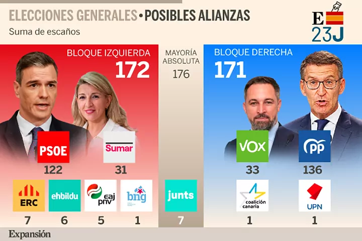 Feijóo, como victorioso, tuvo la primera oportunidad de formar gobierno, pero no pudo sumar una mayoría parlamentaria, por la cual le tocó el turno a Sánchez y este firmó pactos con una variopinta coalición de partidos pequeños logrando que PSOE sobrepase más de los 136 escaños requeridos para la reelección.