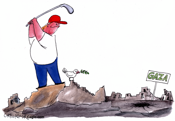 CARICATURA DE CHRISTO KOMARNITSKI EN EL WEBSITE DE POLITICALCARTOONS.COM EN https://politicalcartoons.com/cartoon/292540/trump-at-gaza-golfbeach-resort